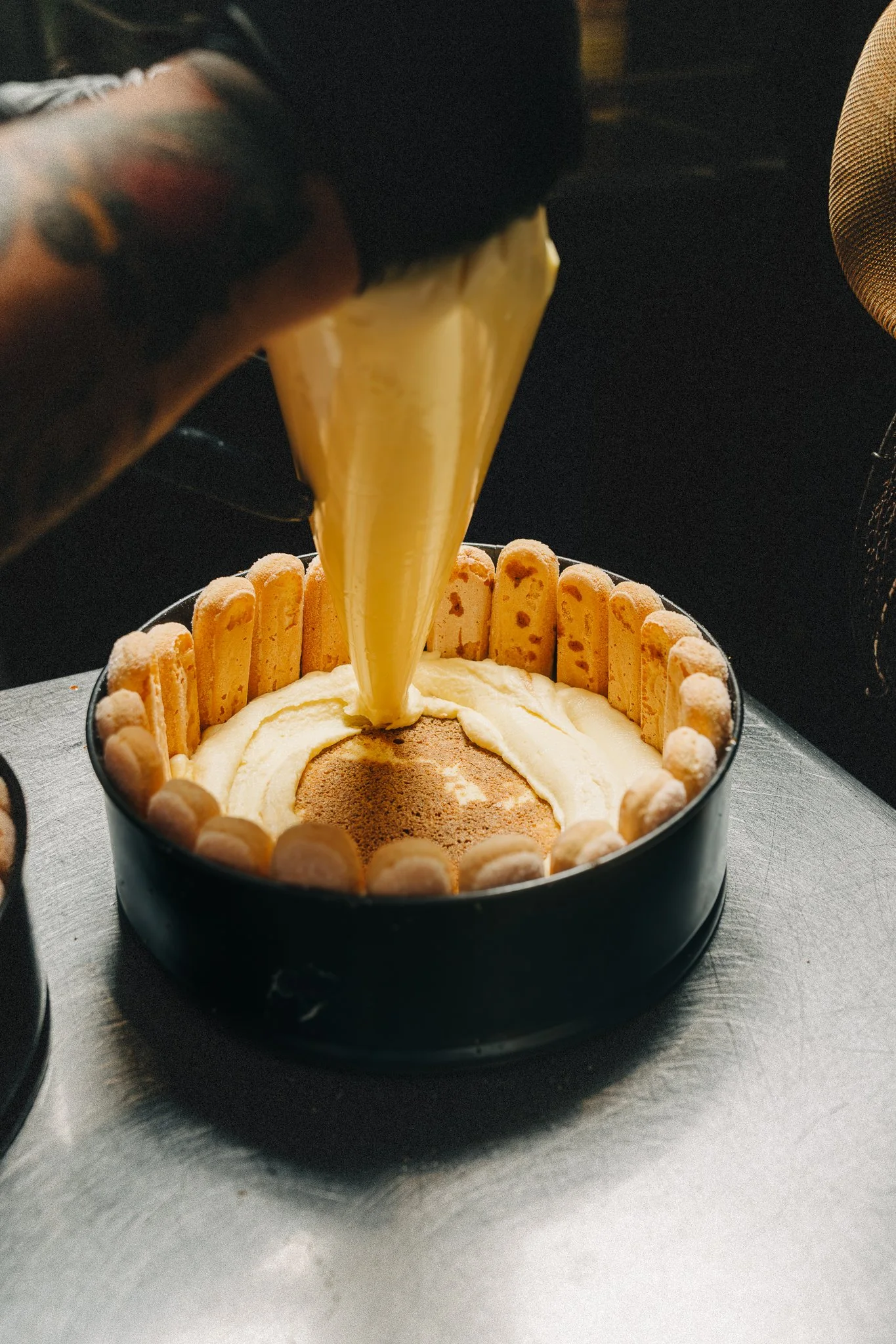 Piping mascarpone mousse in between the layers of the Tiramisu on menu at Chu Mai.