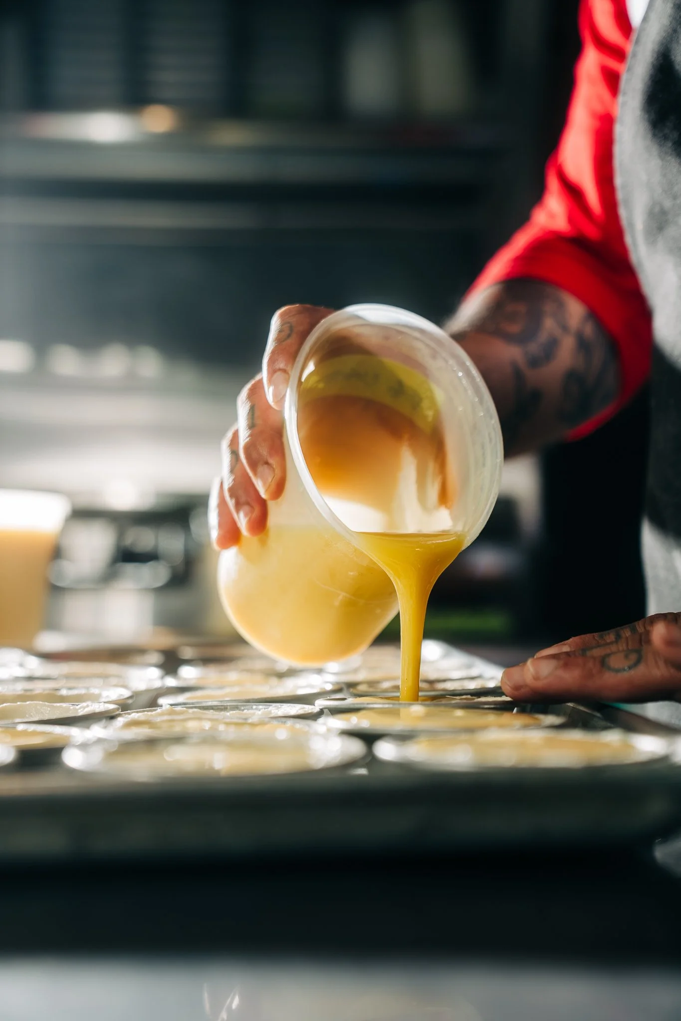 Custardy egg filling getting poured into the puff pastry tart shells.