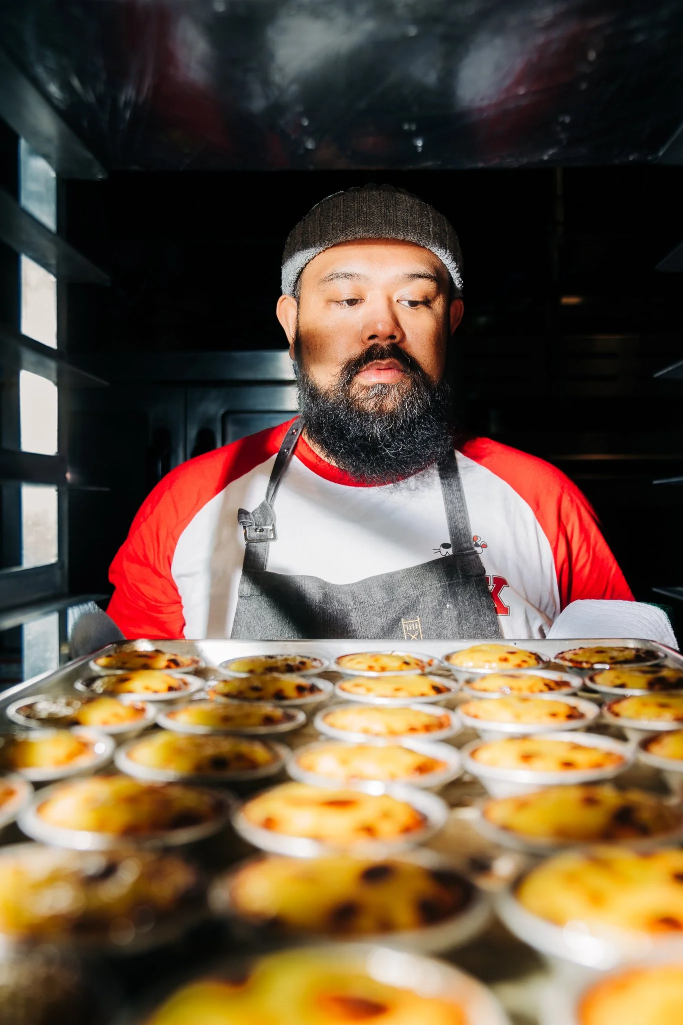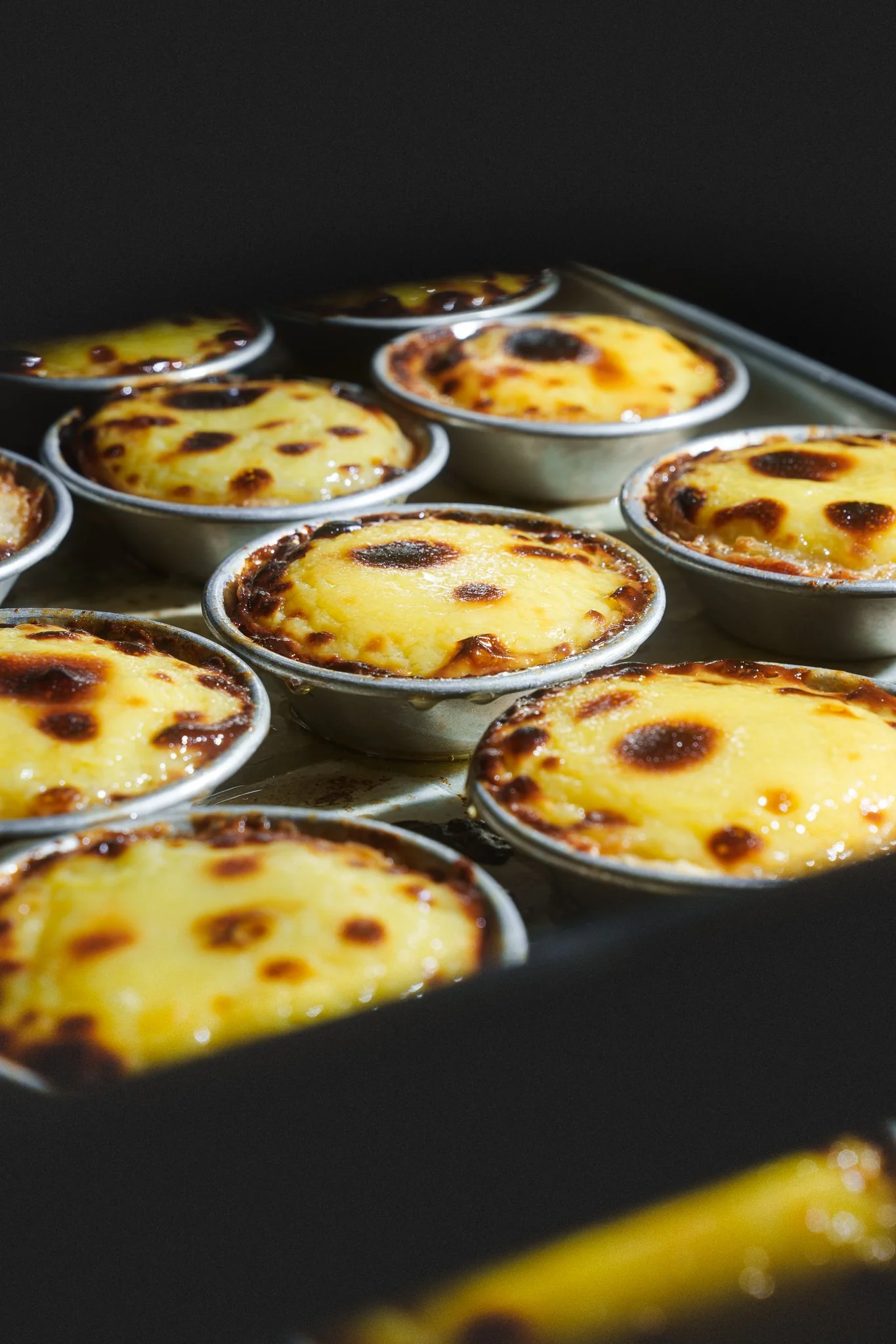 Piping hot Po Taat pulled out of the oven. This dessert is a house made macanese egg tarts, made with puff pastry, and filled with caramelized egg custard.