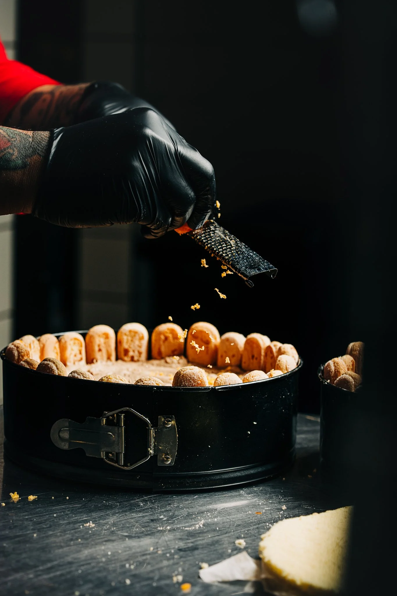 Salted egg yolk getting micro-planed onto the layers of the Tiramisu.