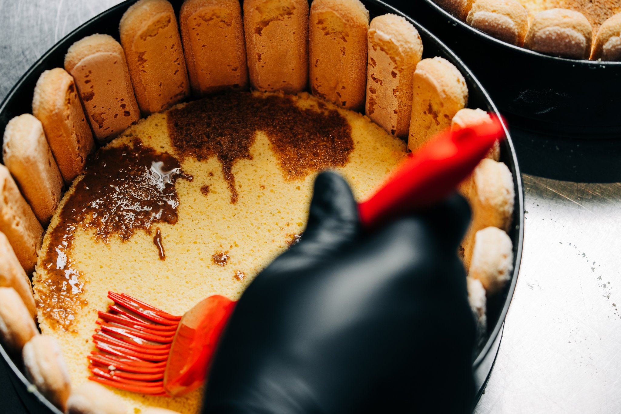 Cake layers of the Tiramisu getting brushed with Vietnamese coffee.