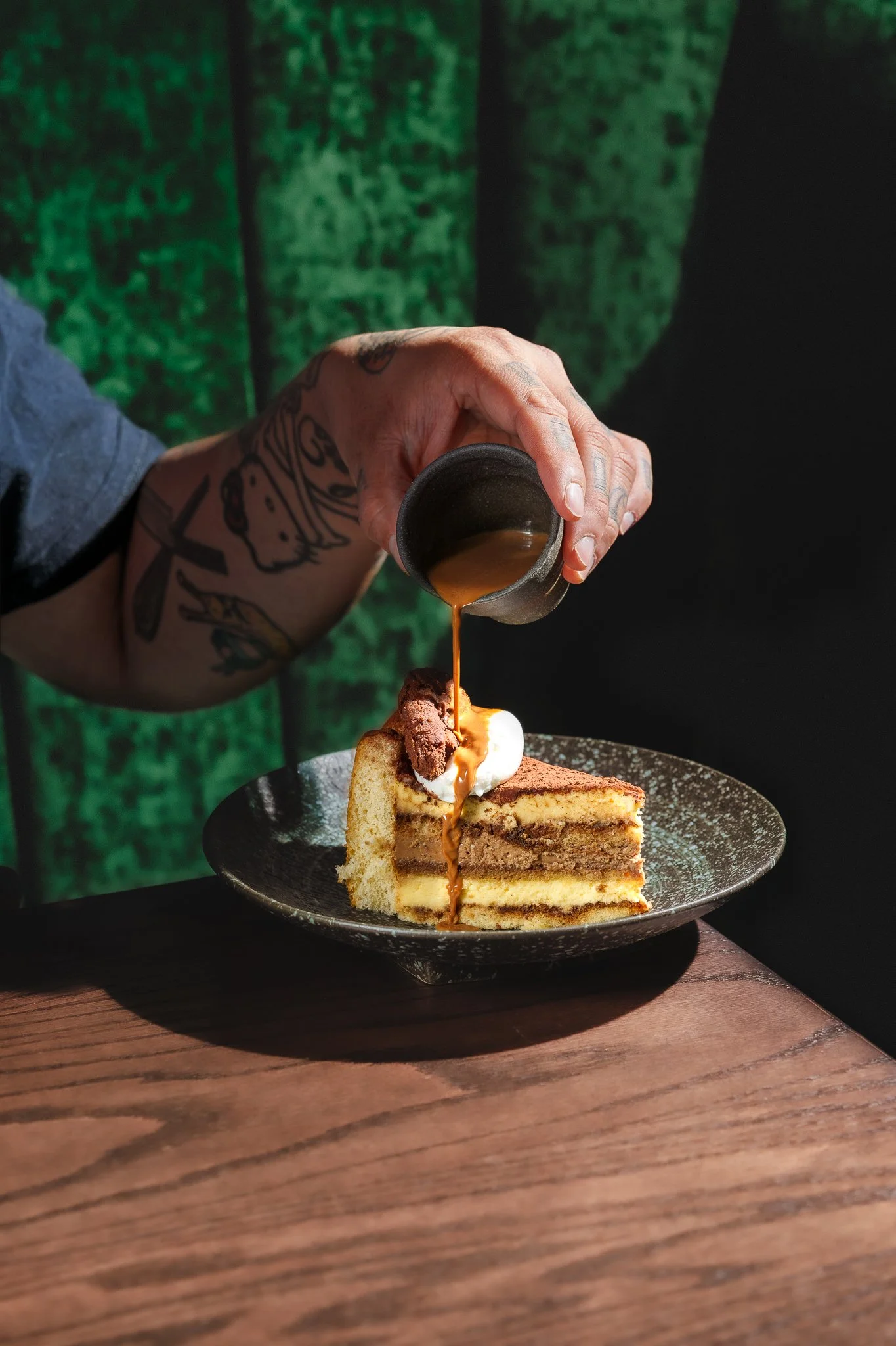 Benny’s reimagined Ca Phe Viet Tiramisu is layered with salted egg yolks, mascarpone mousse, and a dark chocolate sable, then presented tableside with a pour over of Vietnamese Coffee.